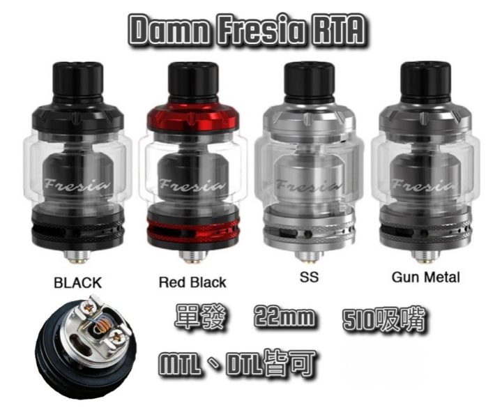 底座直徑:22mm 材質:不銹鋼和玻璃 加油結構:頂部螺紋開蓋填充 容量:2ml/3.5ml 線圈架構:單線圈 進氣:底部可調進氣 吸嘴規格:510