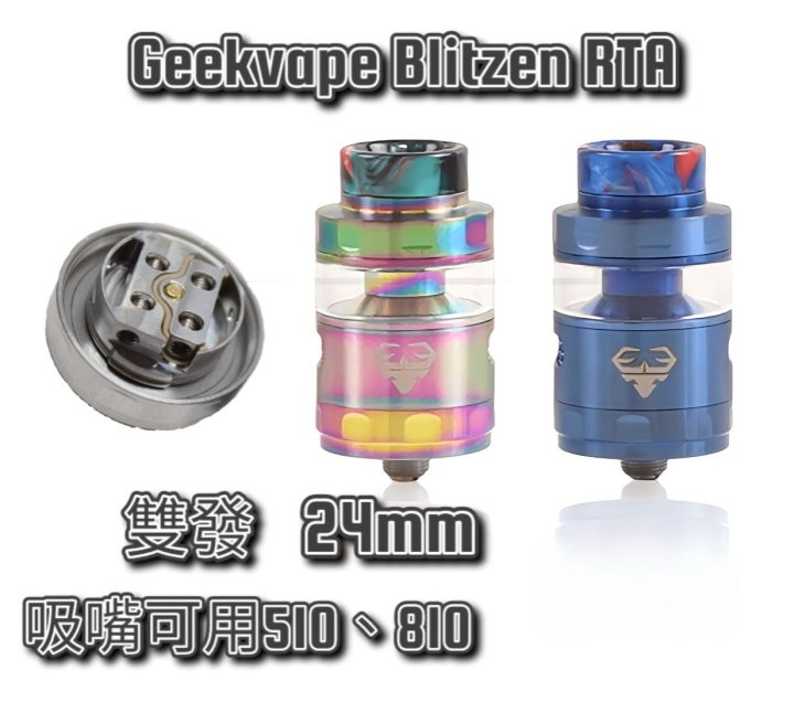 底座直徑:24mm 材質:不銹鋼和玻璃 加油結構:頂部填充 容量:2ml5ml 線圈架構:可單線圈可雙線圈 進氣:蜂巢式可調進氣 吸嘴規格:510 和 810
